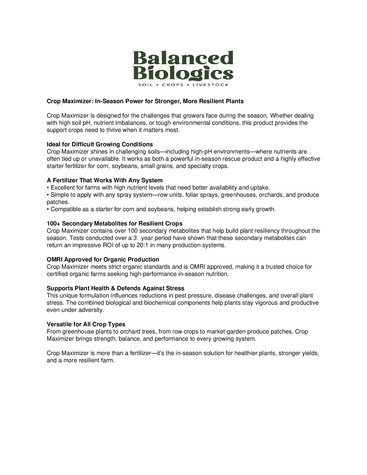 Crop Maximizer is a comprehensive biological crop-enhancement program designed to strengthen plant health, improve nutrient efficiency, and boost crop performance throughout the growing season. Using a targeted blend of biological support, nutrient activators, and plant-response enhancers, Crop Maximizer helps crops achieve stronger emergence, better stress tolerance, and more consistent yields, regardless of soil type or cropping system.